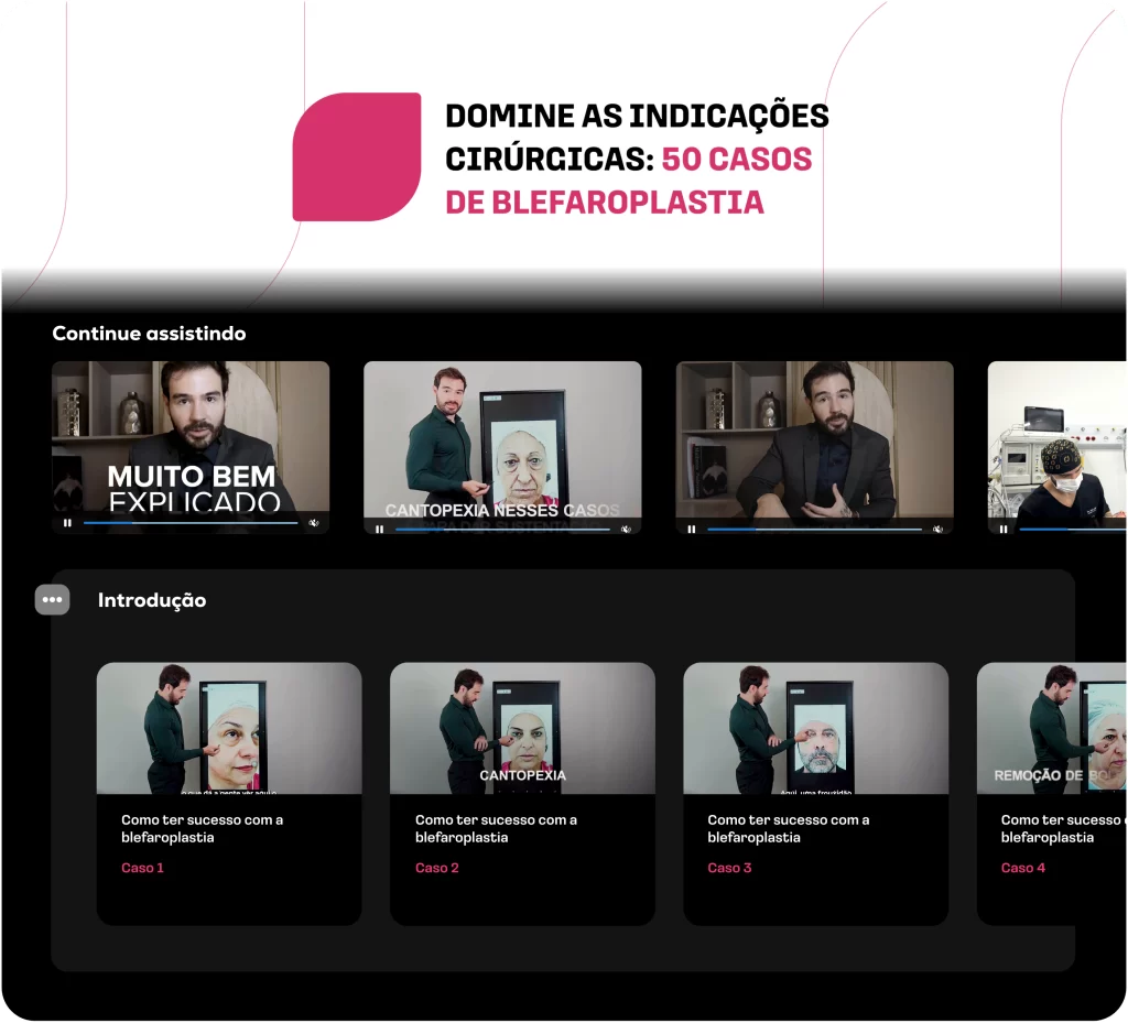 São 50 vídeos com casos reais de indicação cirúrgica de blefaroplastia, com dicas práticas e estratégias de comunicação com pacientes.